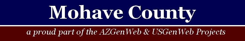 Mohave County Coordinator - Colleen Pustola AZGenWeb State Coordinator - Gail Kilgore AZGenWeb Assistant State Coordinator - Colleen Pustola AZGenWeb-Mohave County, Arizona: In keeping with our policy of providing free information on the Internet, data may be used by non-commercial researchers, as long as this message remains on all copied material. These electronic pages many not be reproduced in any format for profit, nor by presentation in any form by any other organization or individual. Persons or organizations desiring to use this material for purposes other than stated above, must obtain express written permission from the author, or the submitter and from the listed Mohave County Coordinator. © 2004 - Present. Colleen Pustola, Contributors & The AZGenWeb Project. All Rights Reserved. |